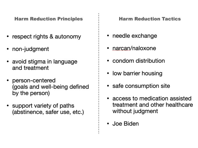 で、これが本題なんだけど、その区別を話すために、こういうスライドを作ったのだけど、ハームリダクションの手法の1つとして、コンドームや注射器の配布などと並べて、ジョー・バイデンと書いたらウケたw pic.twitter.com/BUKhuUaE8X