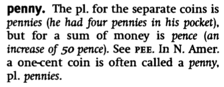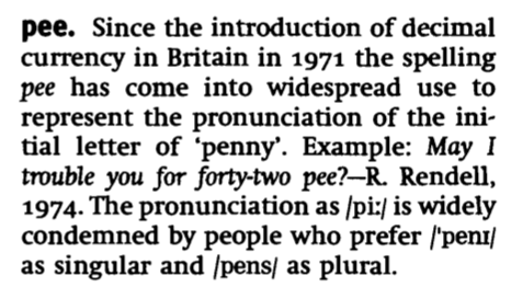 Fowlerで「See PEE」と書かれているからそっちを調べたら、イギリスでは1971年以降penniesのpの字を取ってその読みであるpeeという表記が広まったけど、pence派によって批判された、と書かれている。確かにお金のことをpeeと呼ぶのは嫌だわ。 pic.twitter.com/jTYGQUY0Pd