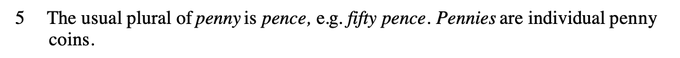 いくつか文法ガイドを調べてみましたが、単にコインの場合の複数形は違う、としか書いてませんでした。スクリーンショットは The New Fowler's Modern English Usage と Oxford Guide to English Grammar から。 twitter.com/Cristoforou/st… pic.twitter.com/R3gwNBtbjT