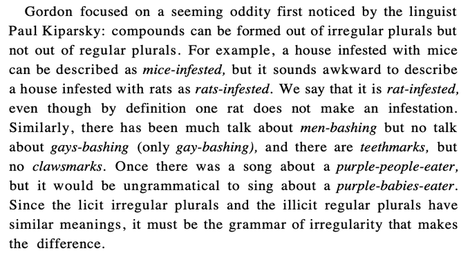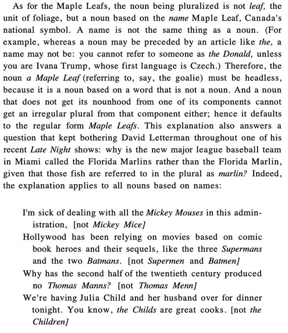 他の方が紹介していたPinker (2014)の該当部分はこんな感じです。ここで書かれているMaple Leafsはホッケーチームのことですけど、Maple Leafは固有名詞だから複数形は変形しない、という説明で、ミッキーマウス等の例もあります。でもこれではペニーとペンスは説明できない… pic.twitter.com/zScolk4DKH