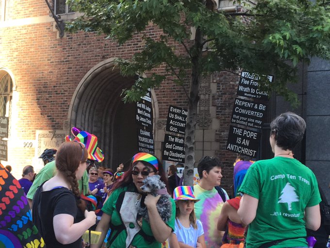 シアトルプライドパレード。やっぱりヘイター来てた。何千人何万人もの人がいるところに出向いて、その何万もの人たちを侮辱・ヘイトするような活動なんて、怖くてとてもわたしにはできないので、ある意味すごいと思う。 pic.twitter.com/VBwvHJh2th